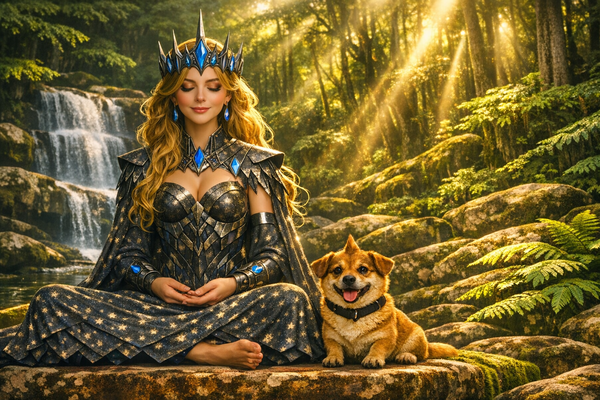 La Princesse Dorioliane médite avec son petit chien Vitou dans sa forêt
